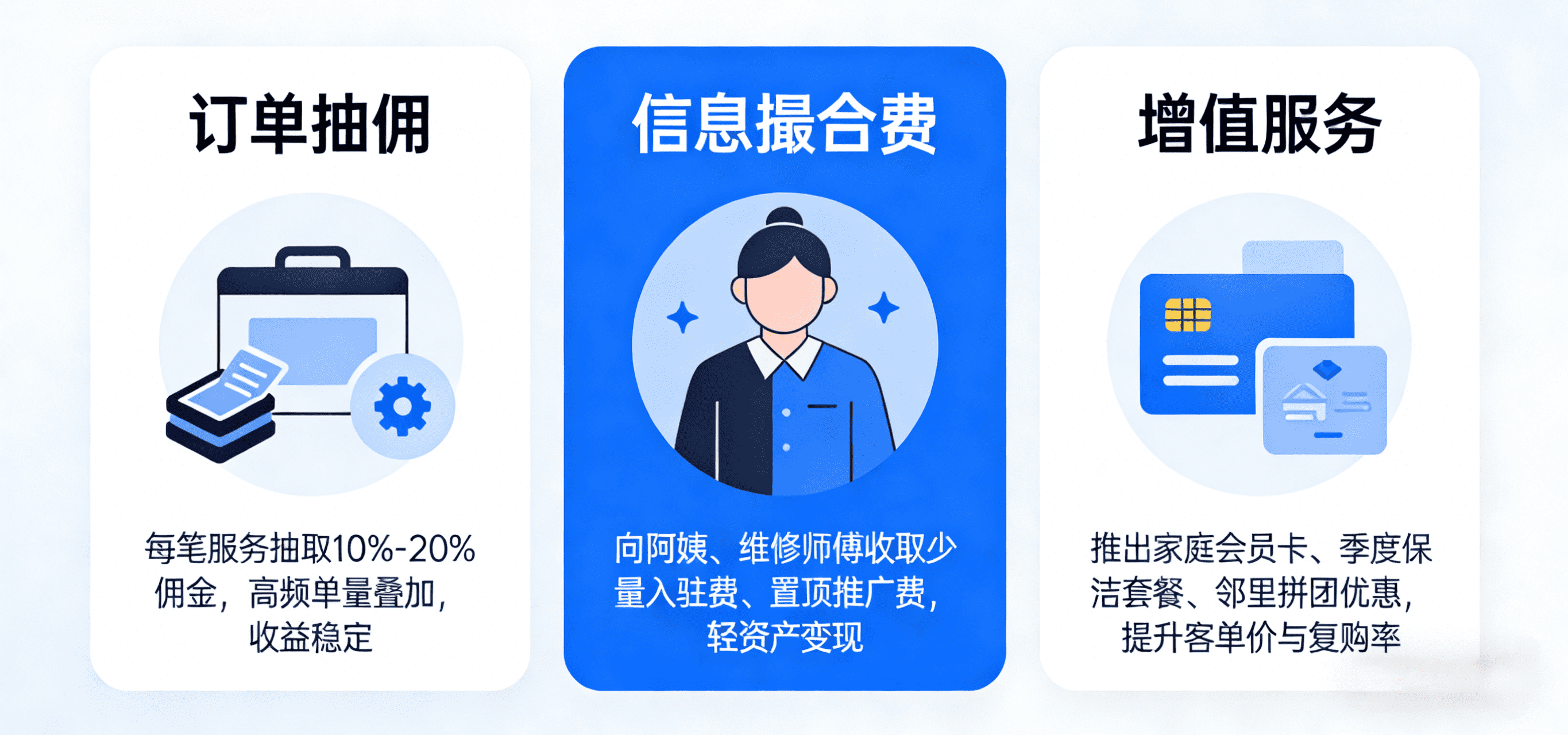 · 信息撮合费:向阿姨、维修师傅收取少量入驻费、置顶推广费,轻资产变现。