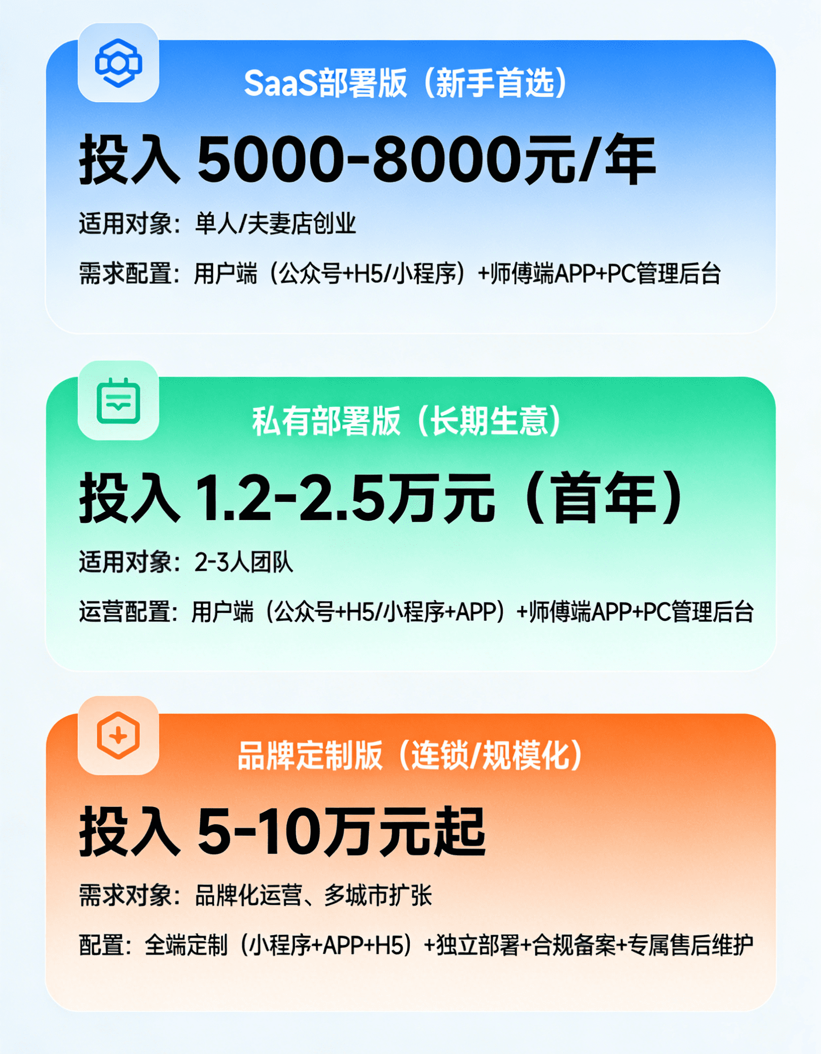 · SaaS 部署版(新手首选)投入:5000-8000 元 / 年、适合单人 / 夫妻店创业,快速跑通模式、验证本地市场;需求配置:用户端(公众号 + H5 / 小程序)+ 师傅端 APP+PC 管理后台;